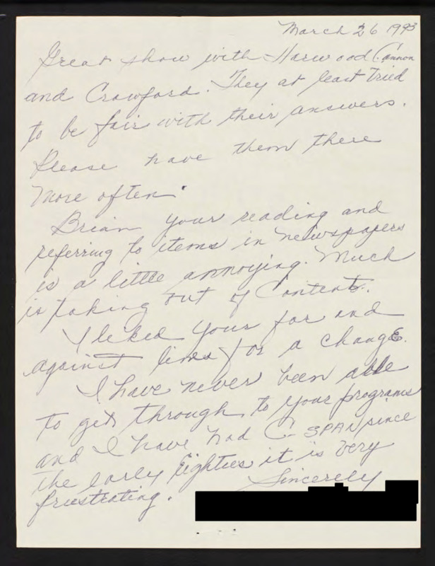 Expresses discontent with actions of a lawyer on program, discusses Republican candidates for 1996, annoyed at Brian Lamb's reference to newspapers.