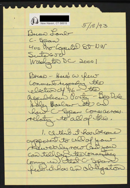 Discusses topics such as Republican bias (apparent on Road to the White House program); Republicans in general; Bob Dole; and how C-SPAN deals with these topics.