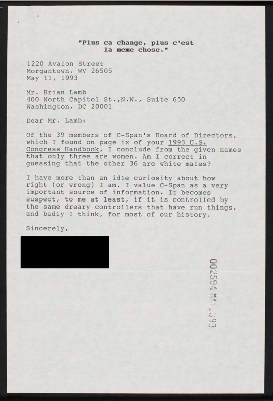 Letter to C-SPAN, 1993-05-11; 26505