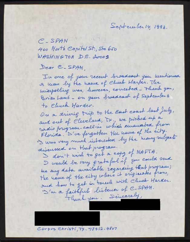 Asks for information about Chuck Harder and a radio broadcast call-in program.
