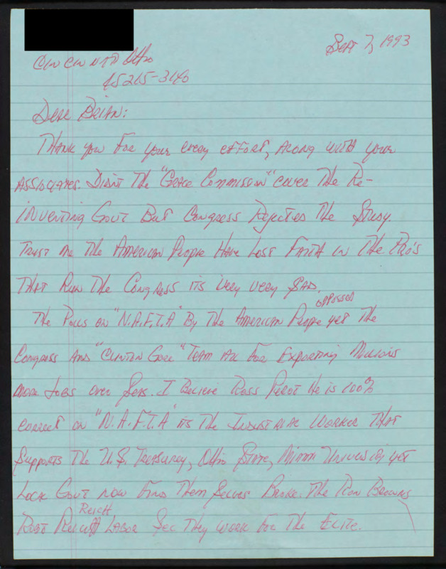 Opposes NAFTA and supports Ross Perot's stance against NAFTA. Attached is an article about NAFTA and about freedom of press & censorship in Mexico.