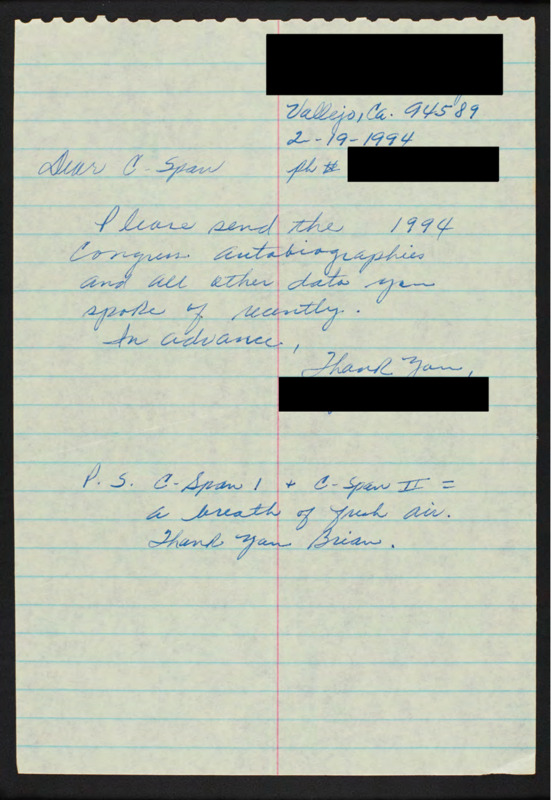 Letter to C-SPAN, 1994-02-19; 94589