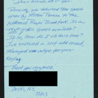 Asks if a Transcript of Mother Teresa's speech at the National Prayer Breakfast is available.