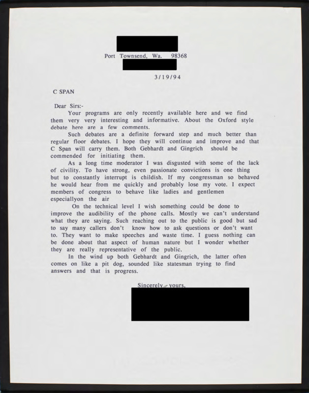 Approves of the Oxford debate format but says they disliked a perceived lack of civility from Congressmen. Wishes for improvement in the audibility of phone calls.