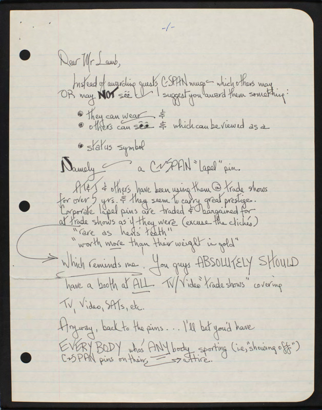 Suggests replacing the mugs for guests with pins, suggests a booth at TV tradeshows.