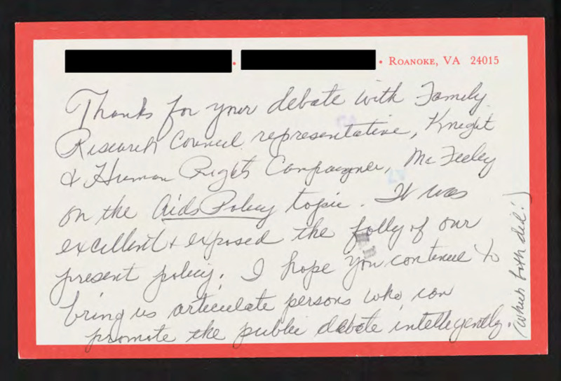 Thanks the network for covering a debate with the Family Research Council and the Human Rights Campaign on AIDS policies.