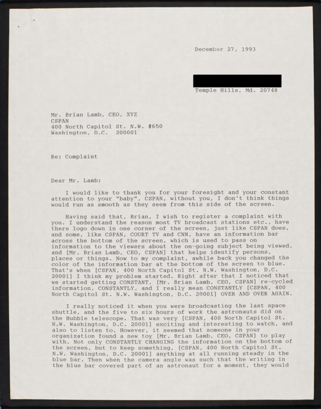 Letter to C-SPAN, 1993-12-27; 20748