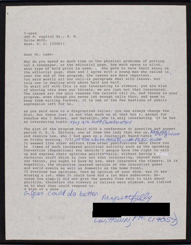 Expresses discontent with boring segment of program concerning technical production of a newspaper, suggests more politically structured call-in shows.