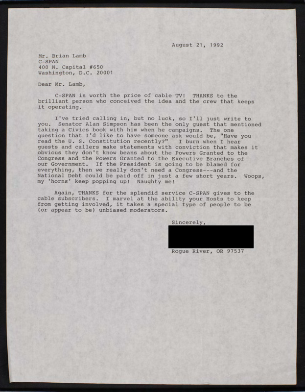 Letter to C-SPAN, 1992-08-21; 97537