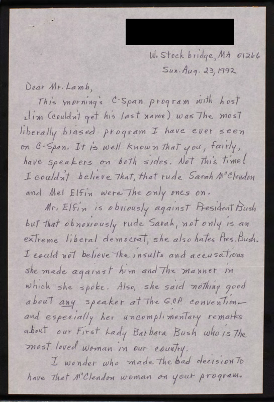 Expresses discontent with journalists guests on C-SPAN and their commentary about Bush, especially Sarah McLendon's, accuses C-SPAN of liberal bias.