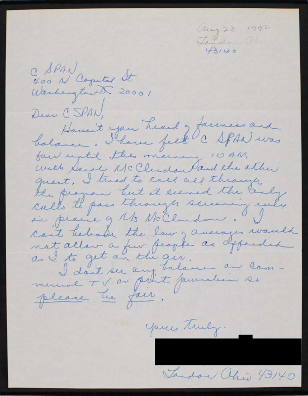 Accuses C-SPAN of bias, especially during call-in show with Sarah McLendon.