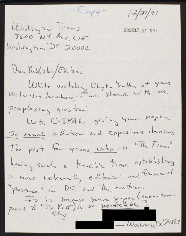 A copy of a letter sent to The Washington Times criticizing the attention they get on C-SPAN.