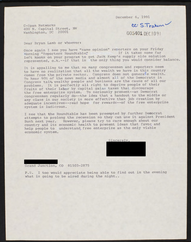 Letter to C-SPAN, 1991-12-06; 81503