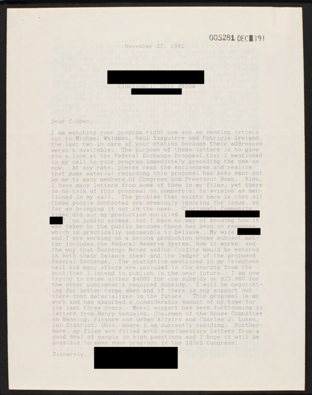 Letter to C-SPAN, 1991-11-27; 45204