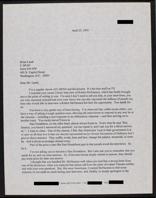 Shares opinions about how Brian Lamb should conduct interviews in relation to an interview with Robert McNamara.