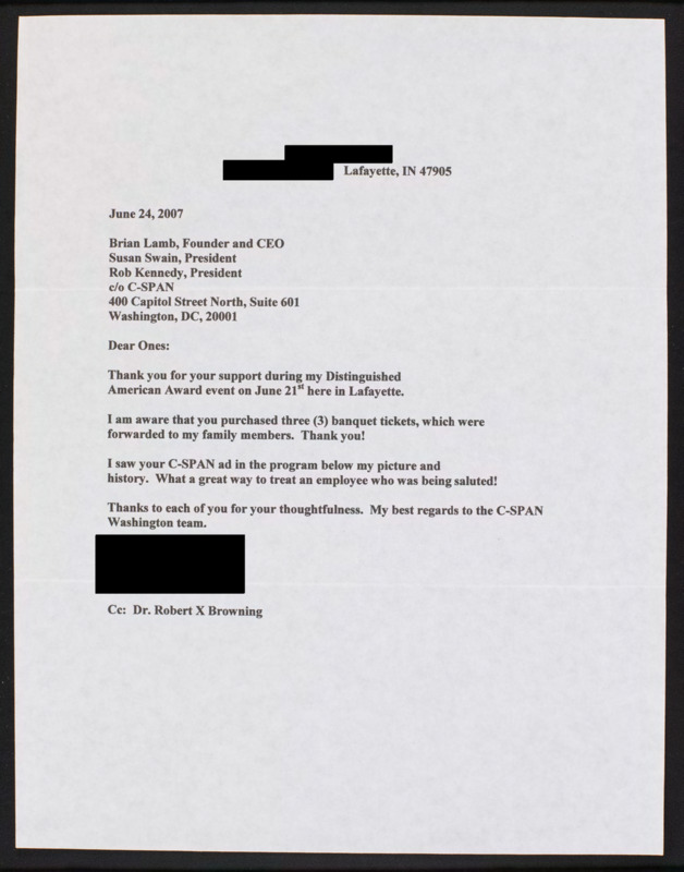Thanks C-SPAN executives for their support during the Distinguished American Award.