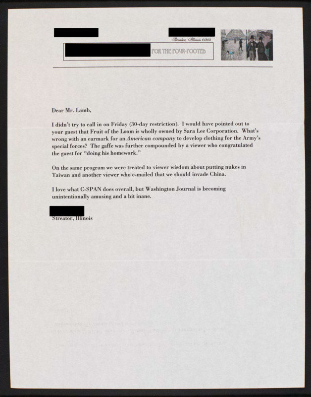 Comments on a panelist's reference to Fruit of the Loom and the U.S. Army during a C-SPAN program; criticizes Washington Journal.