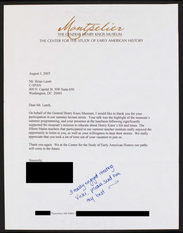 Thanks Brian Lamb for participating in the lecture series at the General Henry Knox Museum.