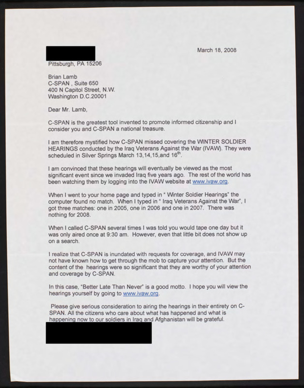 Praises C-SPAN and expresses concern that the "Winter Soldier" hearings were not broadcast.