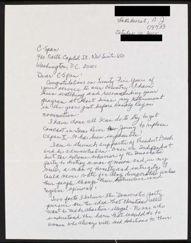 Congratulates C-SPAN on its 25th anniversary, describes problems with a local cable provider, and describes inaccurate depictions of Christians by the Democratic Party.