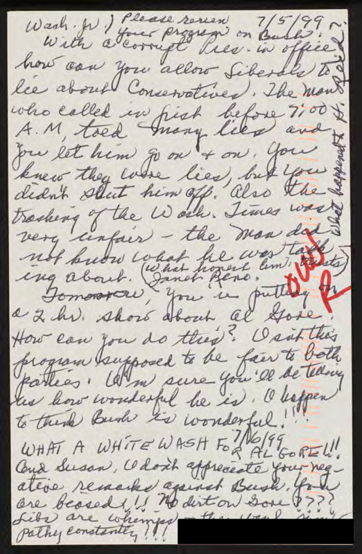 States opinion that C-SPAN is letting liberal callers expound lies about conservatives and takes issue with selected guests.