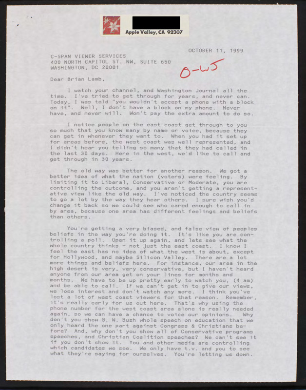 Letter to C-SPAN, 1999-10-11; 92307