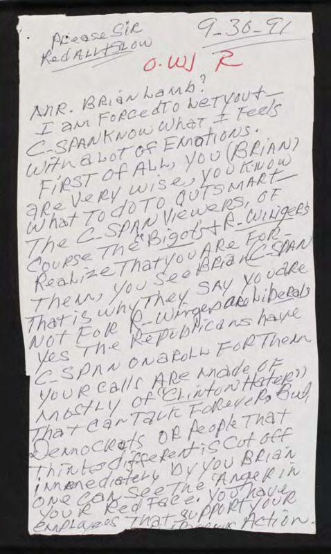 Offers opinion that Brian Lamb favors Republicans and screens calls from Democrats, then accuses him of racism.