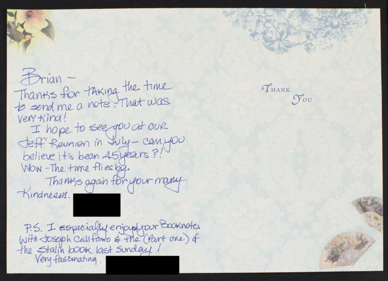 Thanks Brian Lamb for the note and asks if he can make it to a reunion.
