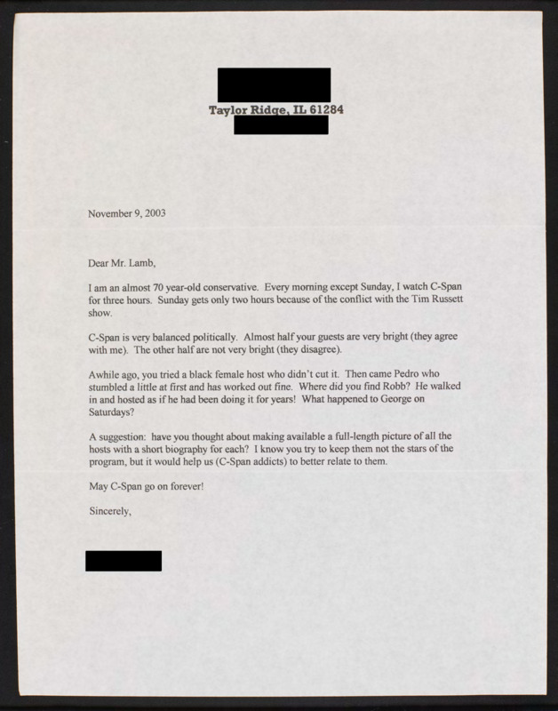 Praises C-SPAN, then offers comments on different hosts, and asks if more information can be given about each host.