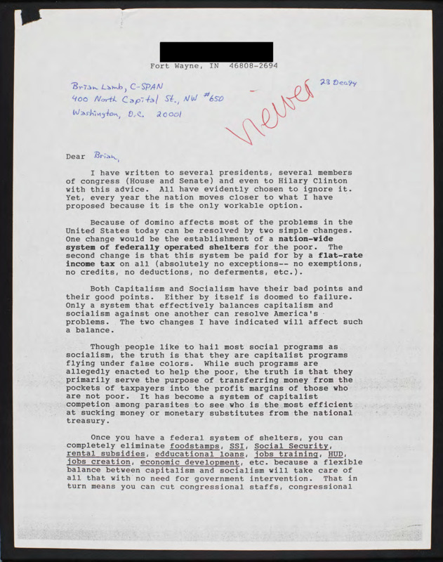 Letter to C-SPAN, 1994-12-23; 46808