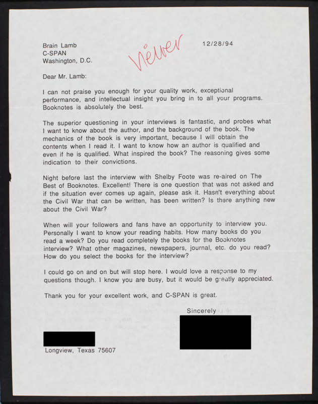 Letter to C-SPAN, 1994-12-28; 75607