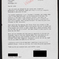 Expresses appreciation for Booknotes, asks Brian Lamb how he prepares for them; concerning a specific episode, asks why books are still being written about the Civil War.