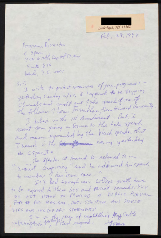 Expresses discontent with broadcast of a Louis Farrakhan supporter's speech for spewing what they felt was racism and antisemitism.