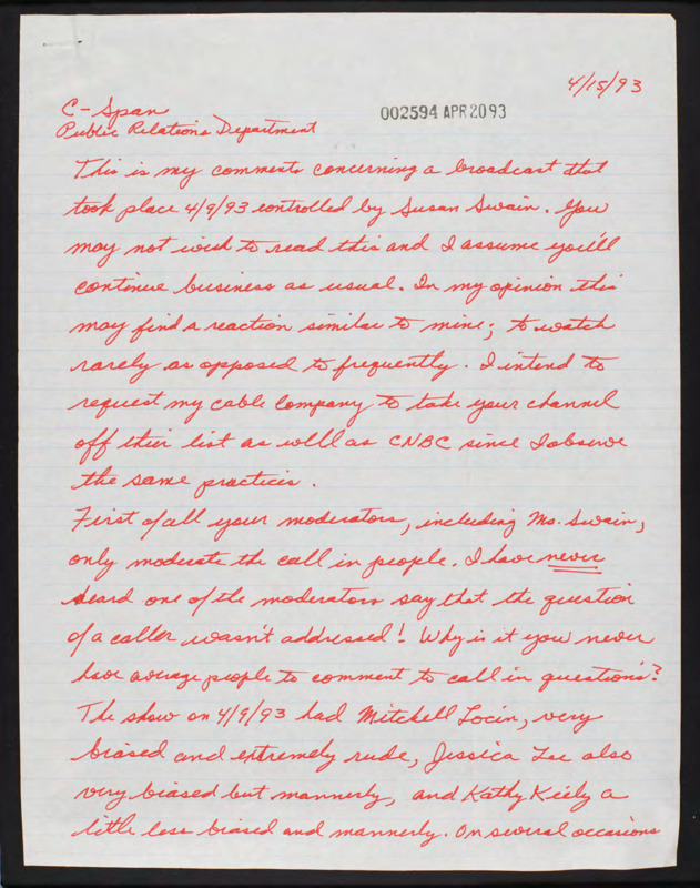 Letter to C-SPAN, 1993-04-15; 10962