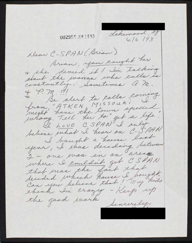 Letter to C-SPAN, 1993-06-06; 08724