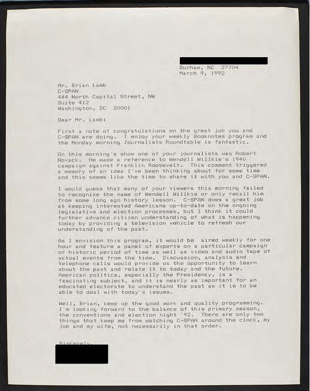 Letter to C-SPAN, 1992-03-09; 27704