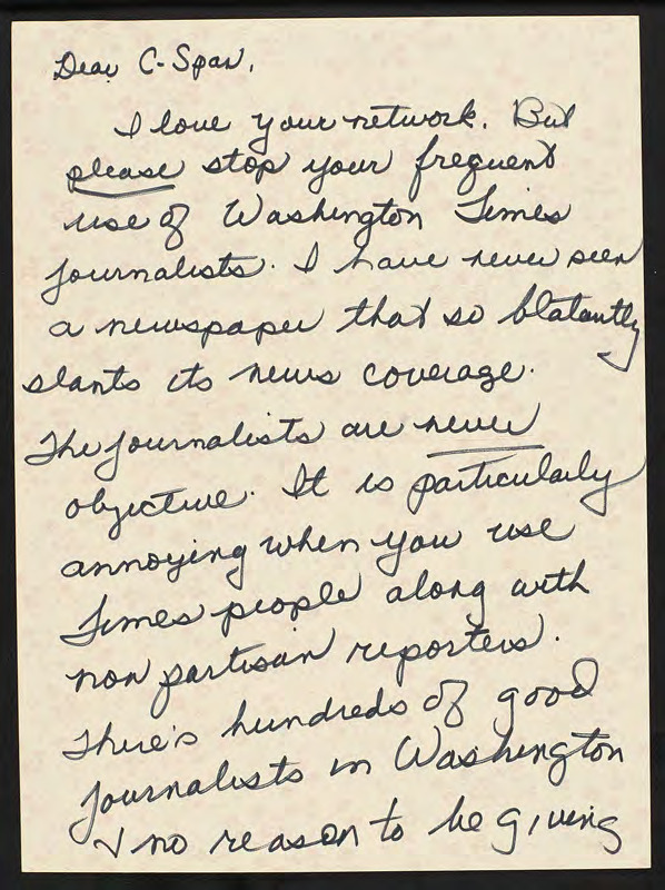 Asks C-SPAN to stop using journalists from The Washington Times because the news agency is allegedly biased.