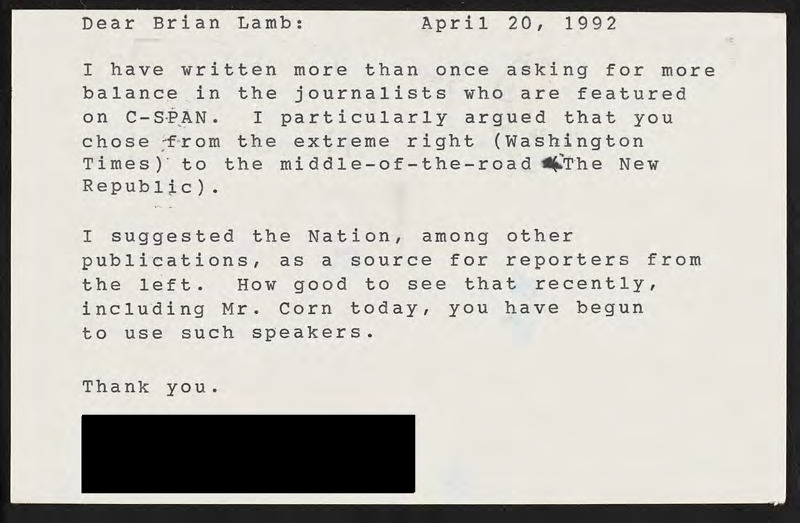 Suggests C-SPAN invite journalists "from the left" instead of the current journalists from "extreme right" news agencies.