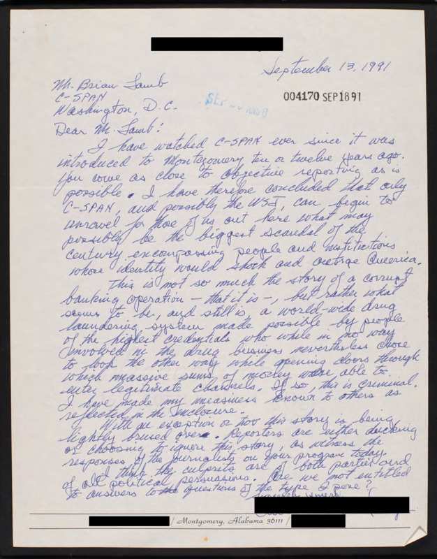 Letter to C-SPAN, 1991-09-13; 36111