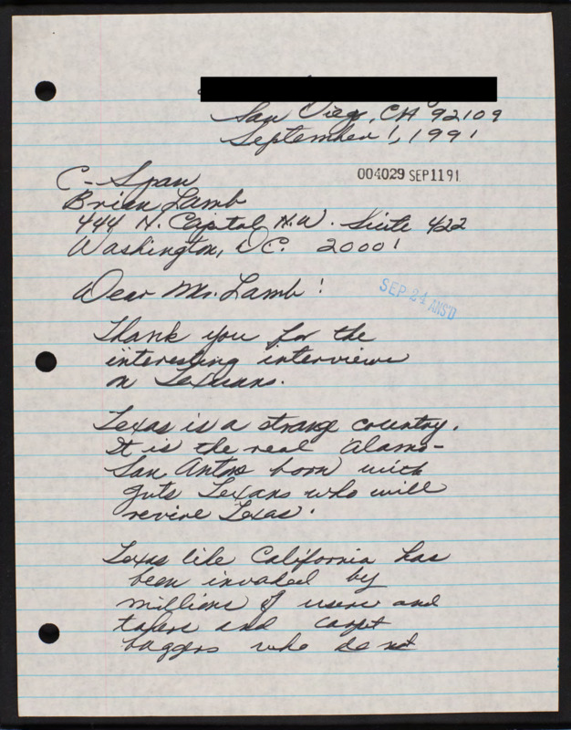 Letter to C-SPAN, 1991-09-01; 92109