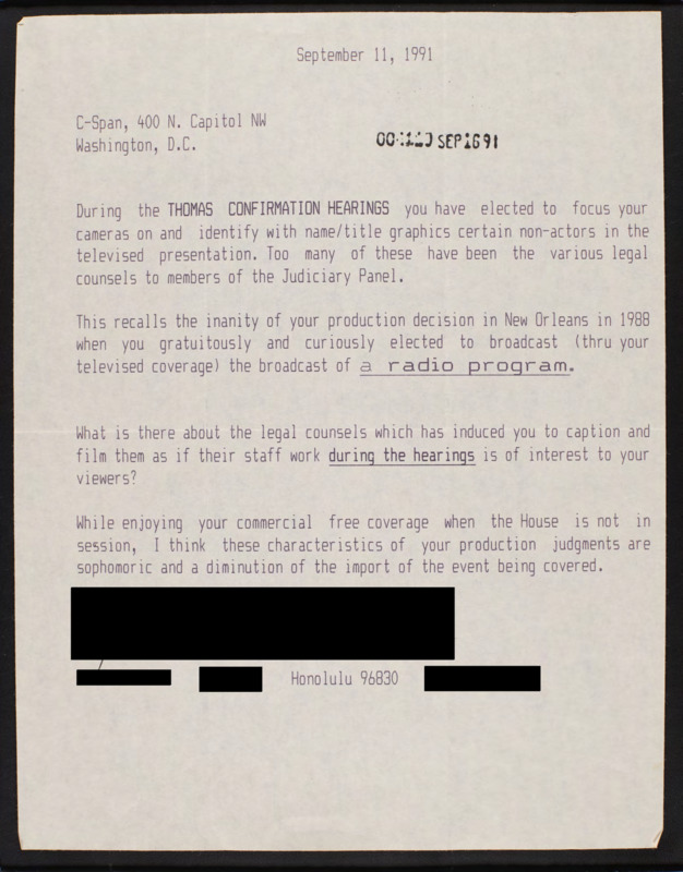 Expresses discontent with camerawork of Clarence Thomas hearings.