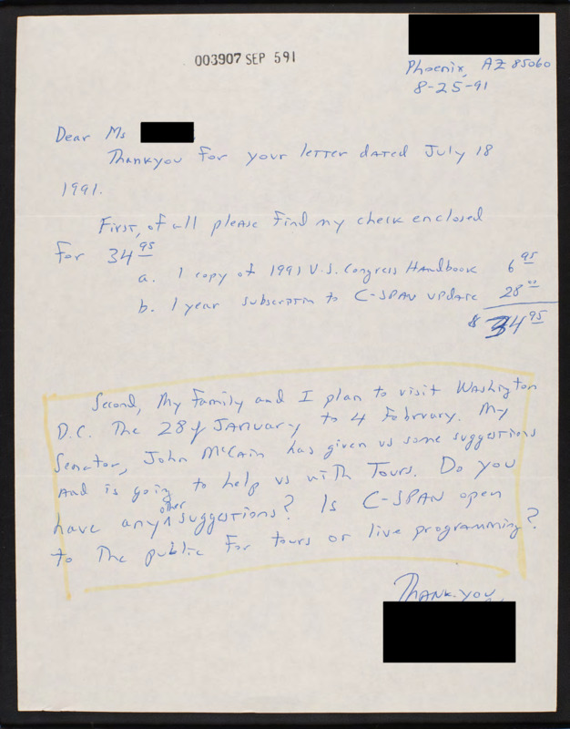 Expresses appreciation for C-SPAN, asks for information about tourist destinations in DC, says that John McCain is going to help them.