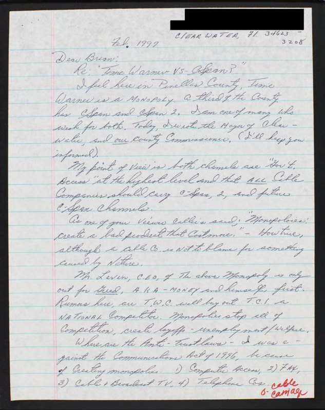 Argues that their local cable company is a monopoly and expresses desire for having both C-SPAN channels; encloses a letter from the cable executive.