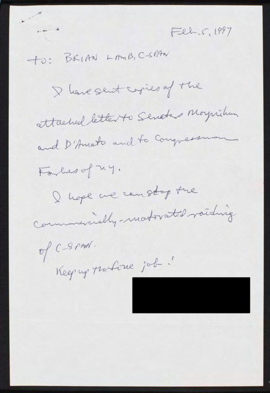 Encloses a letter to their local cable company reporting their concern about reduced C-SPAN 2 broadcasting.