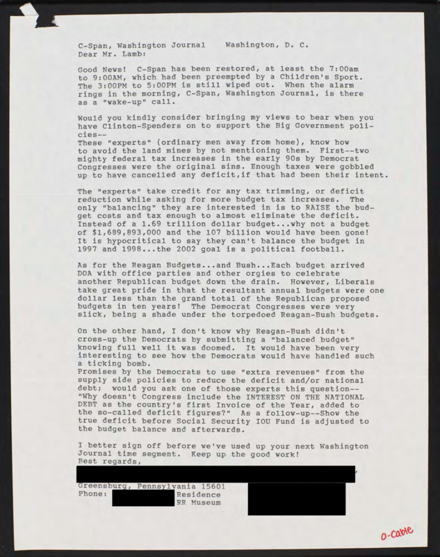 Reports that C-SPAN has been restored in their area, then shares their opinions about federal budgets under Presidents Reagan, Bush, and Clinton.