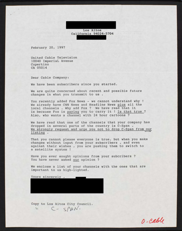 A letter to their cable company expressing concern that they added Fox News and dropped C-SPAN.