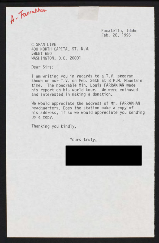 Letter to C-SPAN, 1996-02-28