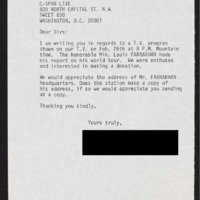 Requests the address of Louis Farrakhan so they can make a donation.