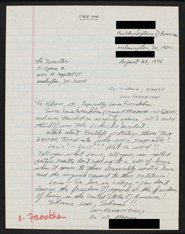 Disparages Louis Farrakhan for his support of Qadhafi.