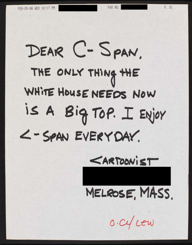 Calls the White House a circus and encloses a political cartoon about the Clintons.